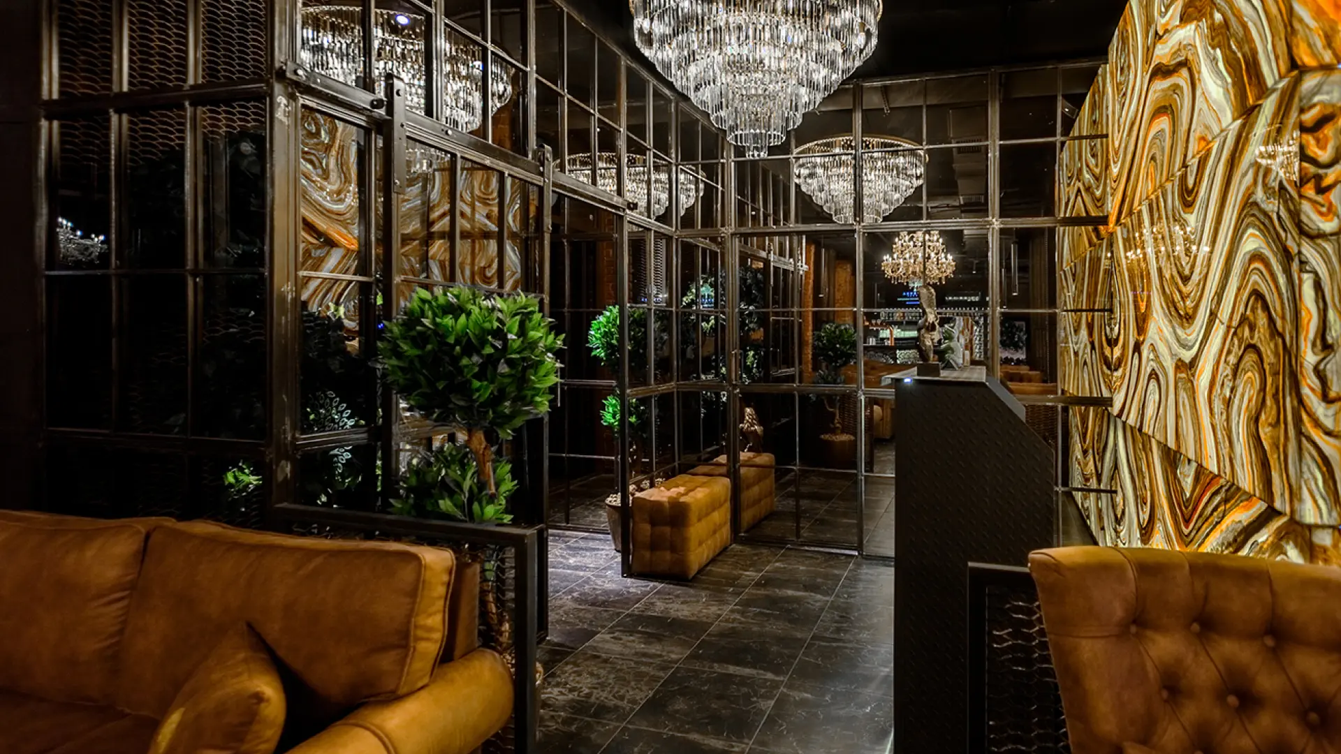Оставить отзывГордость ресторана – коллекция работ современных художников, которая оживляет интерьер. Основной зал оформлен благородно и со вкусом: природный кирпич, жжёный металл, мебель в тонах каштановых плодов и живая декоративная стена. Освещают пространство подлинные произведения искусства – люстры в винтажном стиле. Этот зал словно создан для самых красивых встреч.